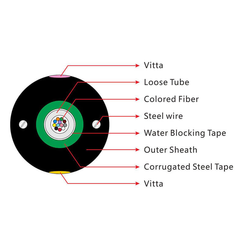 軽い装甲ケーブル,単模様/多模様繊維は,高モジュールプラスチック製の緩いチューブに配置されます.チューブは,水に耐える充填化合物で満たされています.管は PSPの層で縦に包まれていますケーブルをコンパクトで水不浸し状態に保つために,PSPと緩い管の間には水阻害物質が適用されます.鋼テープの両側に2つの並行鋼鉄ワイヤが配置されています.ケーブルはポリエチレン (PE) のシートで完成します.