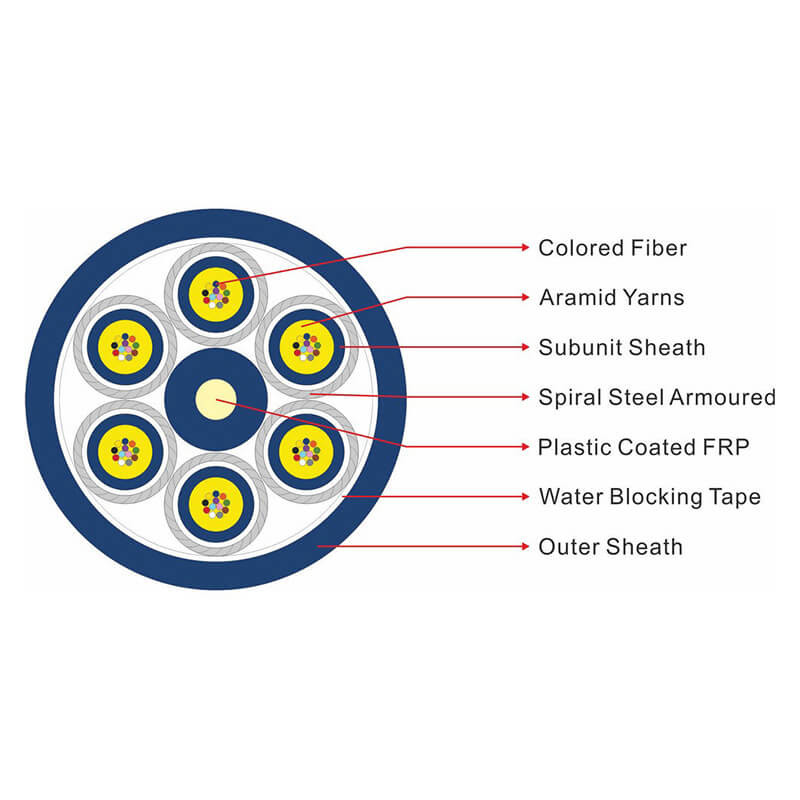 GJAFKV 室内用多コアバンドル型装甲光ファイバーケーブルは,多コアバンドルミニ ф250μm光ファイバー表面で強化された多鎖アラミド繊維である.PVC または LSZH の内層の層は,サブユニットとして,ストランディング表面に挤出されます.亜ユニットと非金属補強材FRP (および可能なマット) は円状に固定されています.中核とシールドの間に水を遮る乾燥テープで包まれたそして最後に,PVC (またはLSZH) カーブは外押しケーブルです.