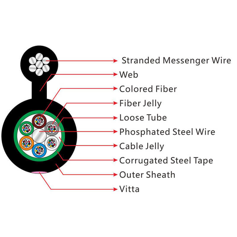 繊維は高モジュールプラスチック製の 緩いチューブに置かれ 水に耐える詰め物で満たされます鋼鉄のワイヤーは,金属の強度メンバーとしてコアの中心に位置する. 管 (およびフィラー) は,コンパクトで円形なケーブルコアに強度メンバーの周りにストランディングされます. PSPがケーブルコア周りに適用された後,この部分のケーブルは,支柱の部分として線付きのワイヤーを伴い,ポリエチレン (PE) 蓋で完成し,図8の構造になります.この種のケーブルは,特に自立式空中設置に使用されます.